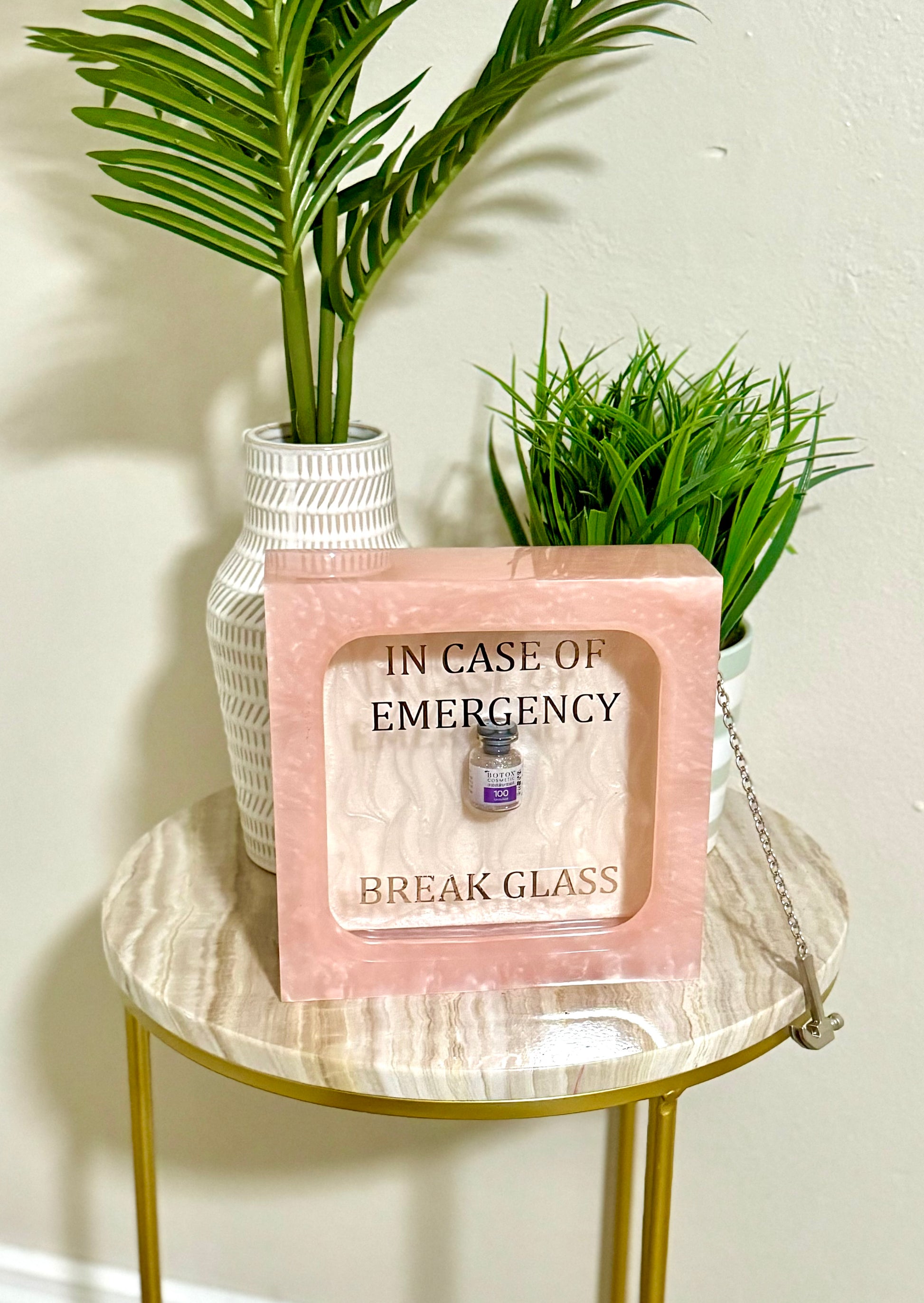 This “In Case Of Emergency, Break Glass” is a hand made resin piece for your med spa, plastic surgery, or dermatology office. This piece measures 8in x 8in x 2 in and features an aesthetically pleasing pearlescent resin box with a Botox vial with your choice of glitter to match your office.