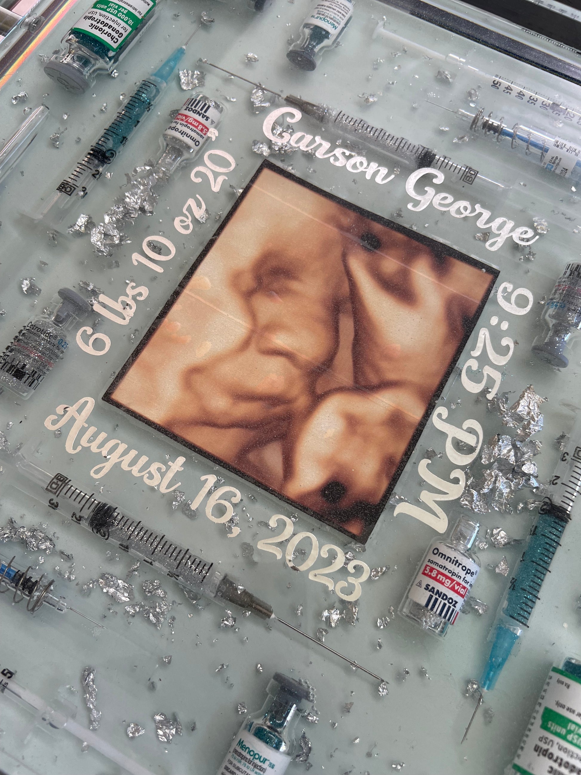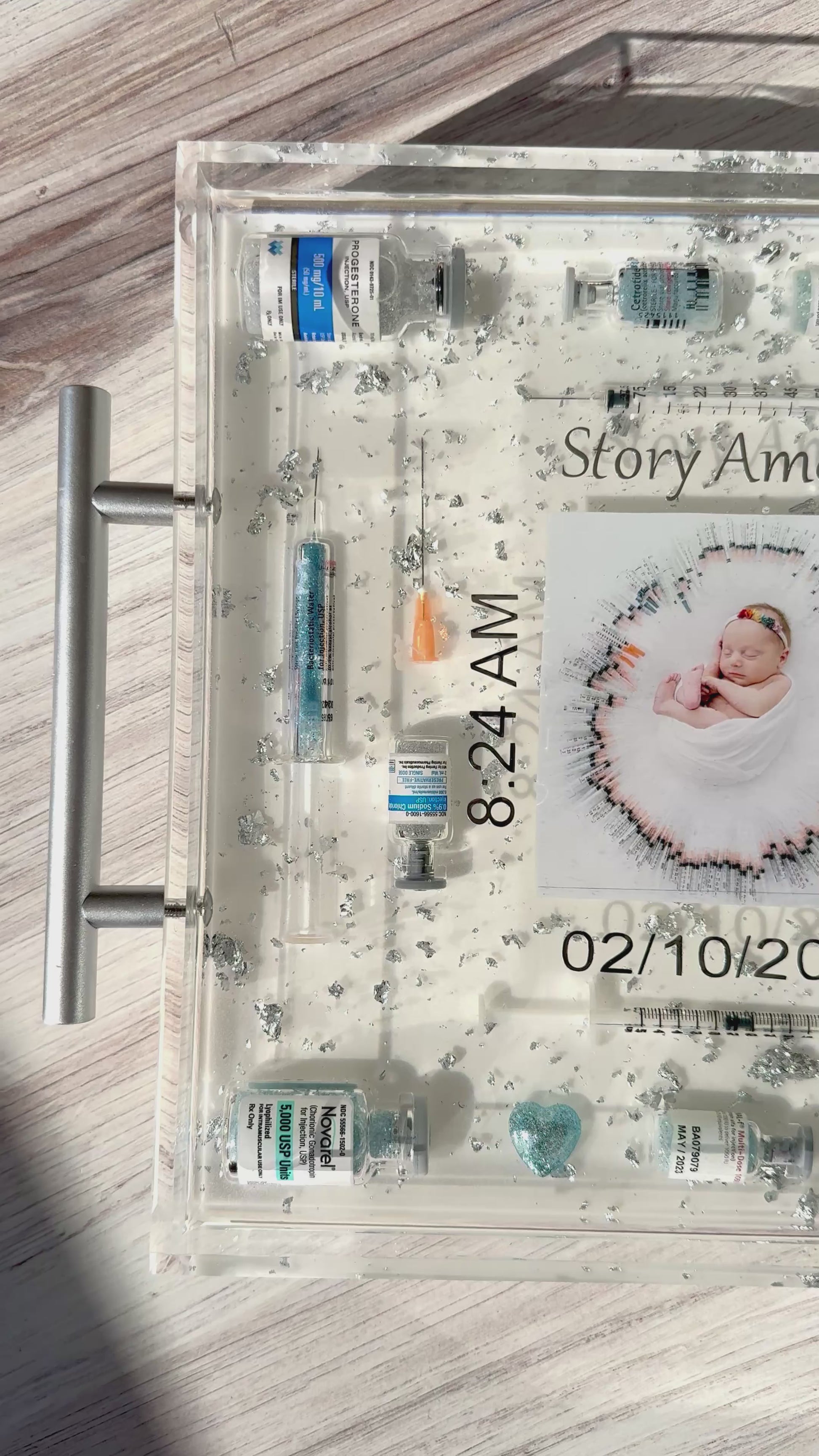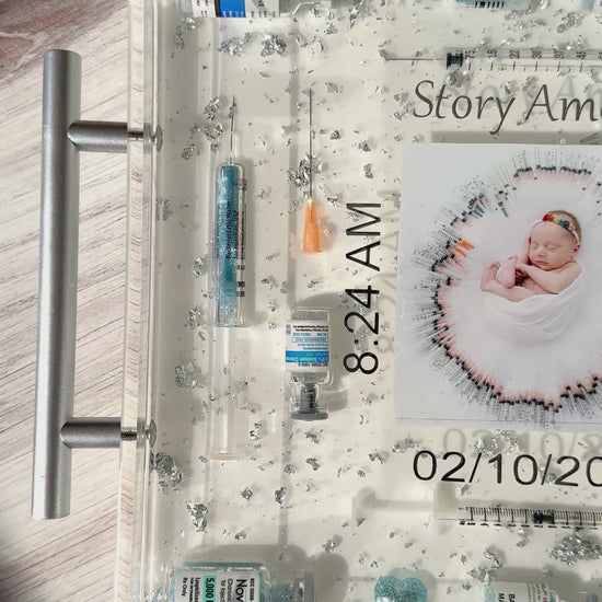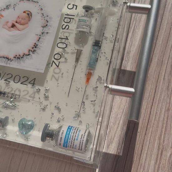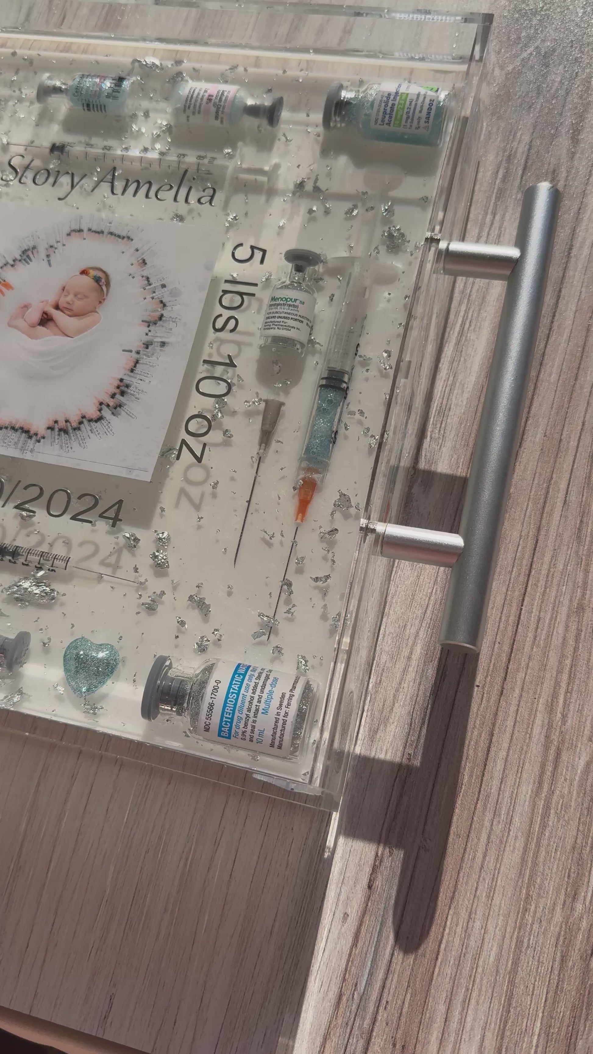 This fertility tray is a unique and sentimental addition to your home or baby nursery, and encapsulates part of the journey in which you endured to bring a beautiful life into the world. Encase your IVF medications, pregnancy tests, ultrasound photos and anything that you may want to be part of this piece of IVF art. You may choose essentially any color as your base, along with the glitter colors to fill up those bottles for a unique and custom look! They are custom made to every order and are arranged differently to provide uniqueness with each design! You may choose either silver or gold handles and accents (Gold or silver flakes correspond to handles selected.) I can personalize the tray with the baby’s name, birthday, weight, length, and time of birth if desired.