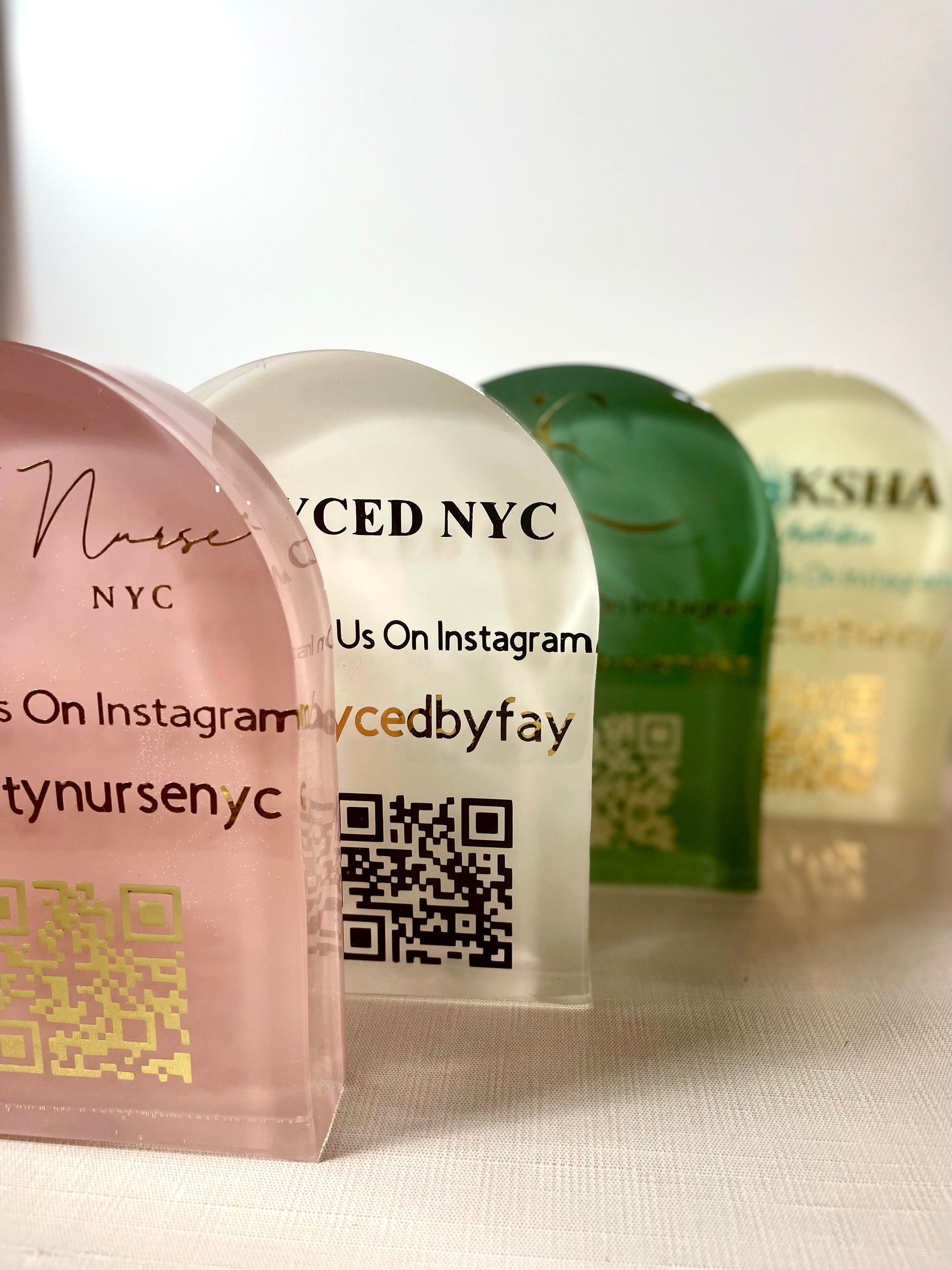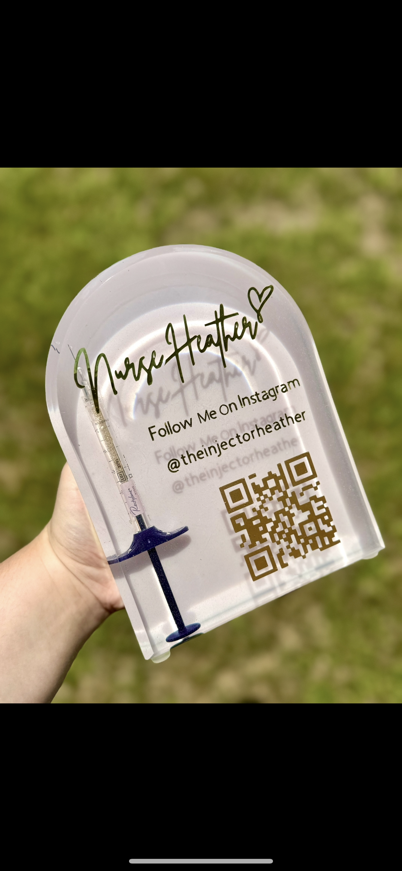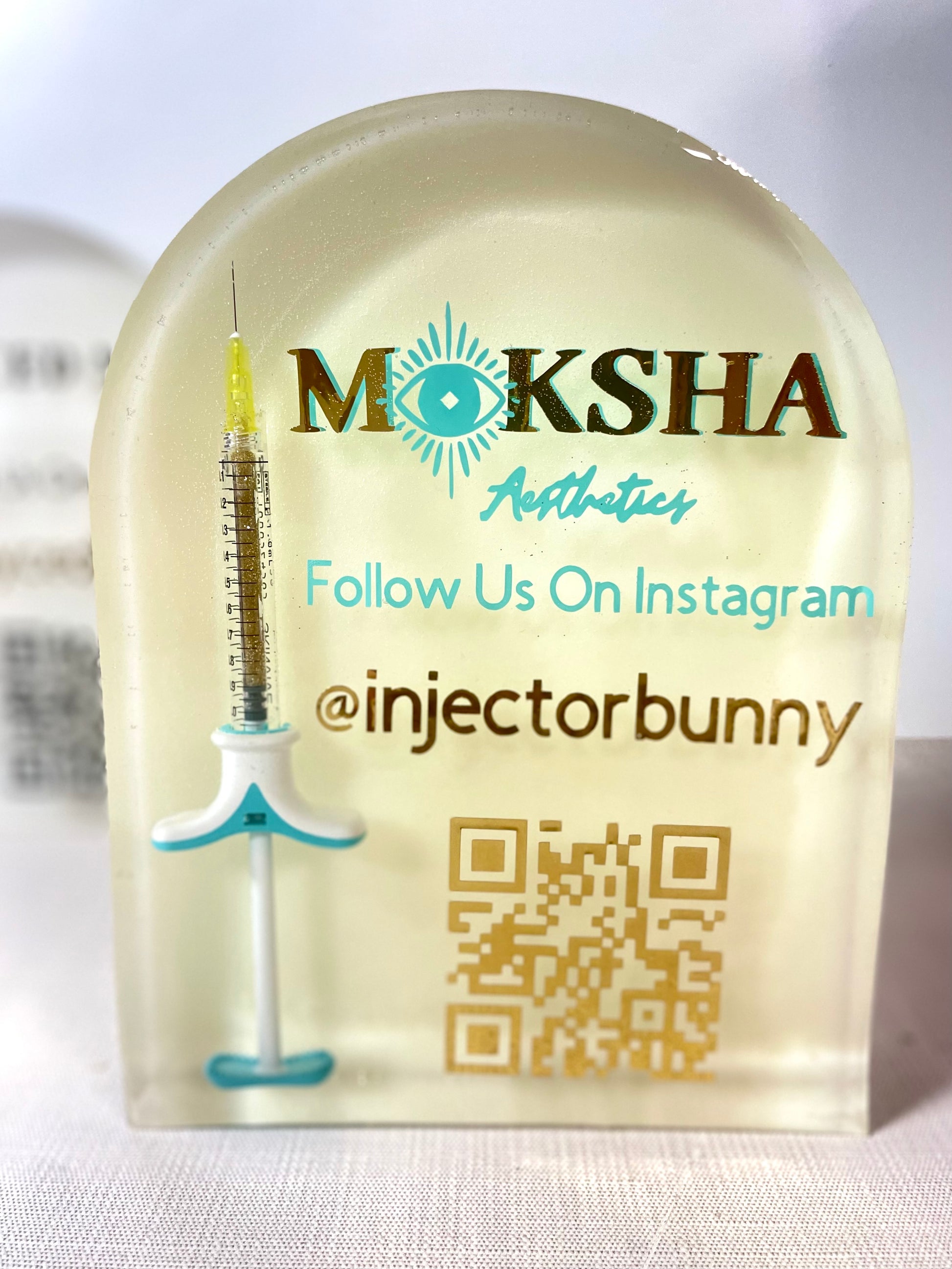 This unique arched business sign for social media is a beautiful, modern, and chic addition to your med spa or office. Within this piece is a completely encased filler of choice. This piece includes your business handle and instagram information and QR code, which appears to be floating in the middle for an absolutely stunning presentation.
