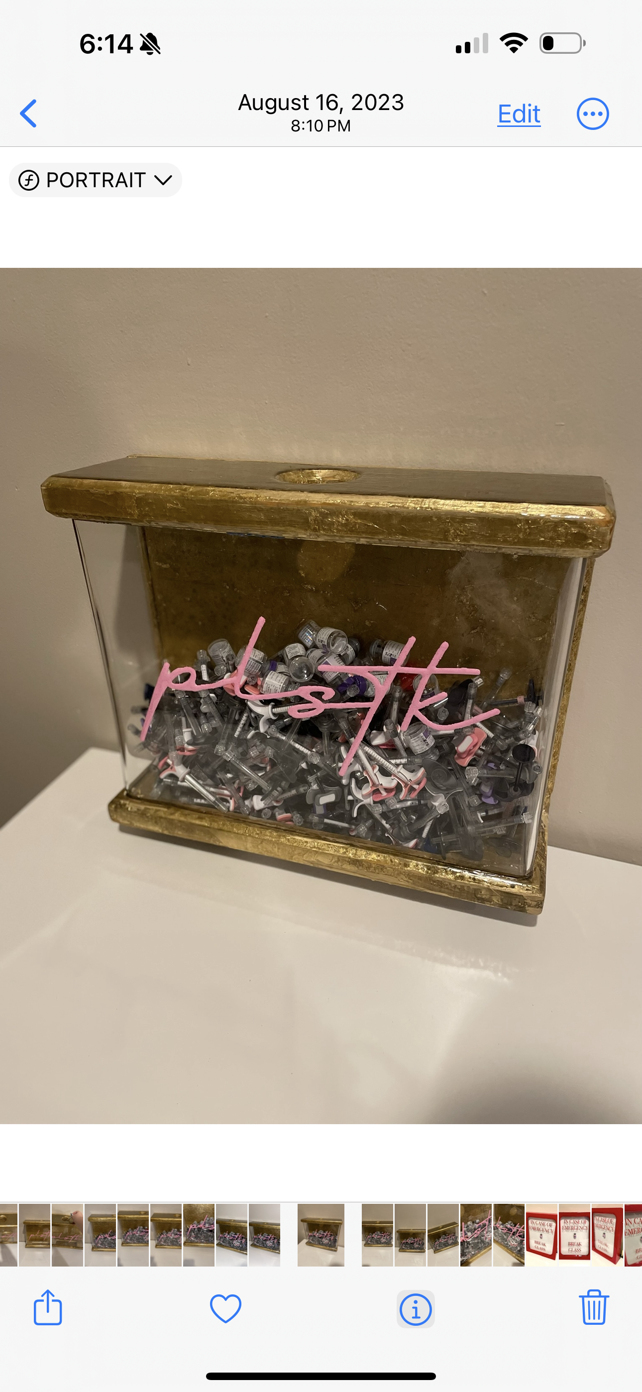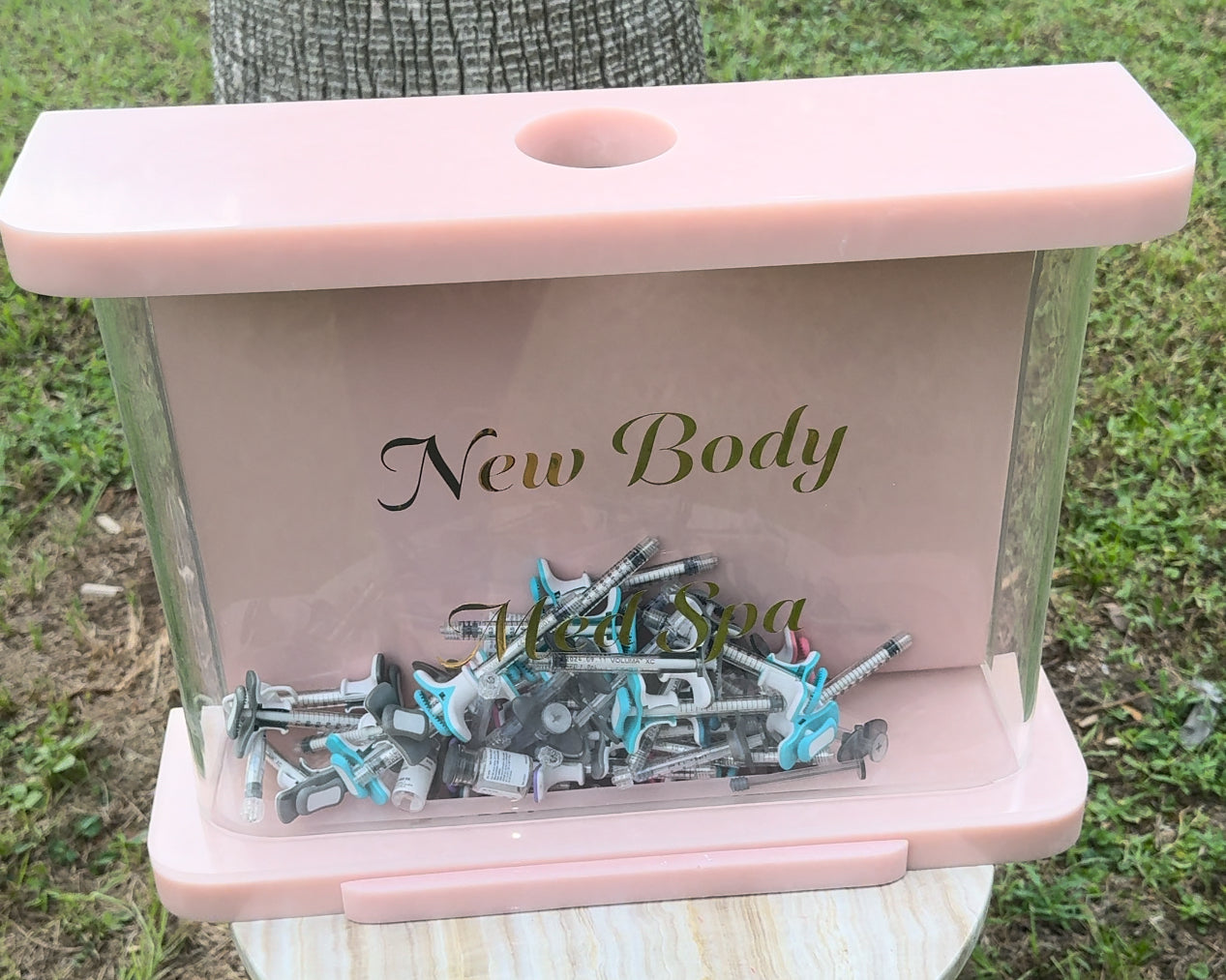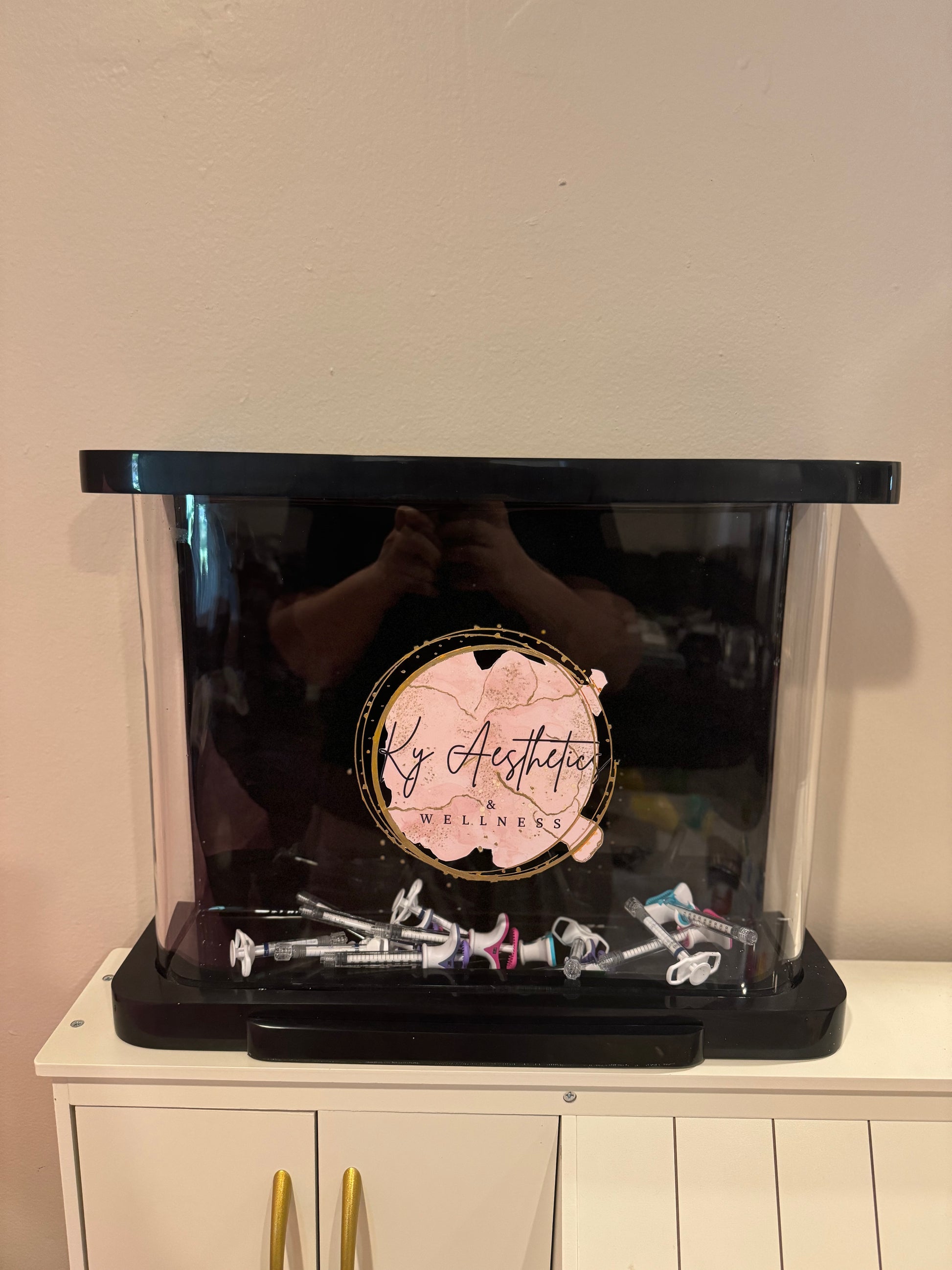 Display your empty syringes in this “sharps container” inspired piece. This can be hung on the wall or sit on top of a counter. Place your empty syringes and vials through the top of the piece. When it’s time to empty into a red bin for pick up, there is a latch at the bottom that pull open to allow the products to fall out.
